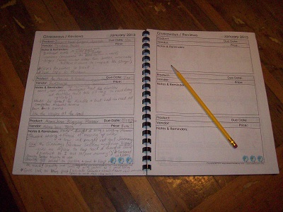 I tend to have tons of blog post ideas and never get around to actually blogging about them, or I forget to do it. The "Monthly Blog Calendar" is great to help me keep on track and the "Monthly Blog Planning" page helps me to plan out what I want to blog about. I usually just come up with the content for my blog posts as I write them, but with the "Blog Post Notes" page, I can plan out what I'm going to say ahead of time and save time once I'm at the computer. The "Giveaways/Reviews" page is wonderful for keeping track of my thoughts about a product while using it so I can remember them when it comes time to write the review! It gives you a place to keep track of when the review is due, which is helpful to me so I don't forget to post it! I found that I needed more room for my notes on a product, so I printed an extra page of "Giveaways/Reviews" with an extra page of "Blog Post Notes" on the back to make sure I had plenty of room for my thoughts.